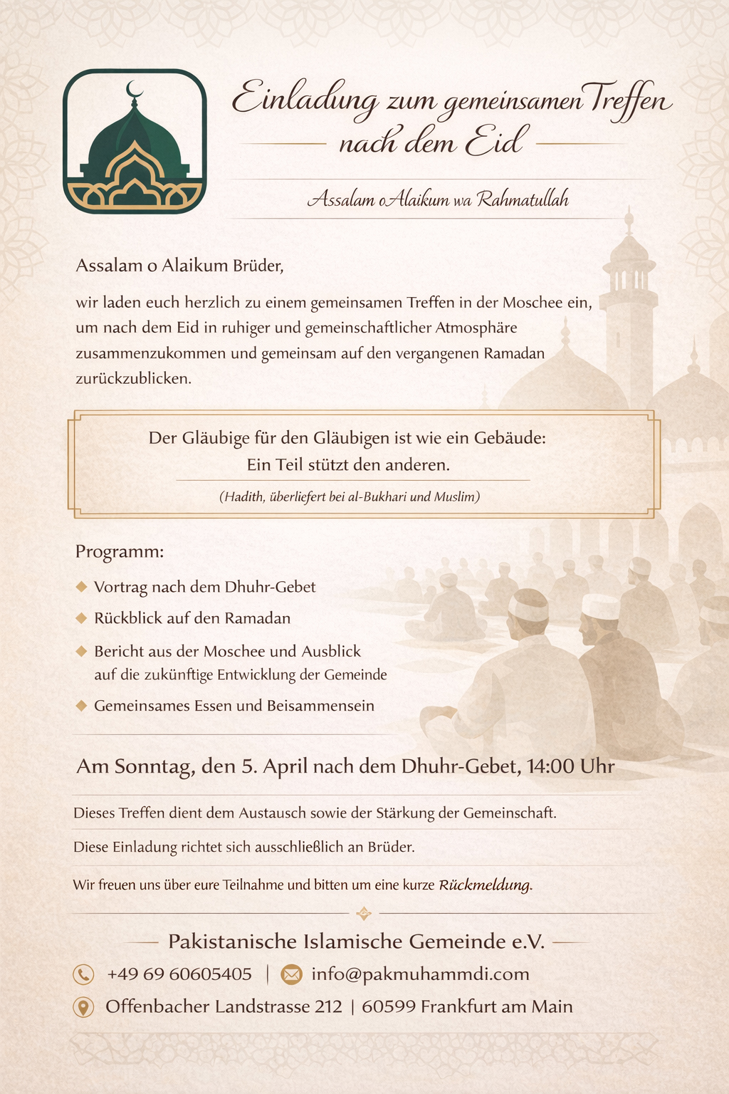 wir laden euch herzlich zu einem gemeinsamen Treffen in der Moschee ein, um nach dem Eid in ruhiger und gemeinschaftlicher Atmosphäre zusammenzukommen und gemeinsam auf den vergangenen Ramadan zurückzublicken.